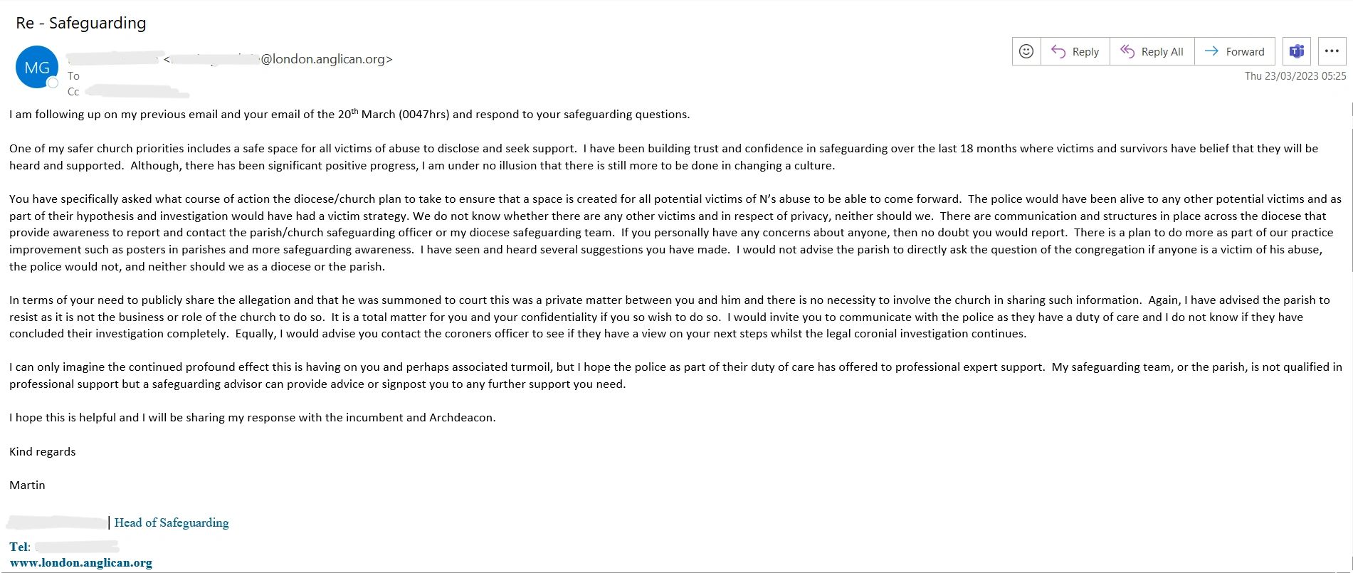You can read the email sent to me from the London Diocese's Head of Safeguarding below: